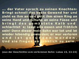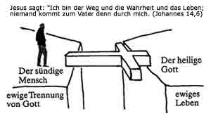Gott hat für uns also einen Weg aus der Sünde, aus der Trennung zu Ihm, einen Weg zum ewigen Leben - DANK JESUS! ![]() Unser Schöpfer hat Erbarmen, übt Gnade mit uns sündigen Menschen. Der Vater liebt uns als seine Kinder. Er schenkt uns durch Jesus neues ewiges Leben. Dieses kann heute schon beginnen und wird nach ihrem Ableben auf einer neuen Erde, einer neuen Schöpfung weitergehen. Gott hat für uns ein neues Paradies geschaffen, wo es keine Sünde, keine Schmerzen, keine Krankheiten, keine Sorgen und keine Hoffnungslosigkeit, wo es nichts Böses mehr gibt. Und das Tor zu diesem Weg, der Schlüssel durch die Tür zur neuen Welt ist unser Heiland Jesus Christus! Jesus ist der Weg zum ewigen Leben. Jesus ist am dritten Tag nach seinem Tod am Kreuz auferstanden und er lebt jetzt bis in alle Ewigkeit. Jesus lebt, Halleluja!!! Alle Menschen, die an ihn glauben, werden nach ihrem körperlichen Tod auch auferstehen, dass heisst ihr Geist, der nicht sterben kann, wird in einem neuen wunderbaren Körper wohnen. Man kann es nicht fassen, welch ein Wunder: Gott liebt uns so sehr, dass er Jesus für uns am Kreuz als Sühneopfer sterben lassen hat. Der Schöpfer hat seinen Sohn für uns gegeben! WUNDERVOLL! Ein Liebesbeweis! Das ist das unbezahlbare Geschenk von dem wir schon im ersten Schritt gesprochen haben. Jesus liebt auch Sie, und zwar bedingungslos; seine Liebe gilt unabhängig von dem Ausmass der Verfehlungen, die Sie in Ihrem bisherigen Leben getan haben!!! Indem Gott seinen Sohn Jesus Christus in die Welt gebracht und als Sühneopfer für unsere Sünden am Kreuz sterben lassen hat, hat er eine Brücke geschlagen - eine Brücke, die die ewige Trennung vom Schöpfer überwindet! Nur einer konnte diese Brücke sein, einer der wahrlich heilig ist, einer der völlig ohne Sünde ist: Jesus Christus, unser Heiland! Gott ist durch Jesus selbst als Mensch auf die Erde gekommen. 2. Entscheidender Schritt Gott hat in seinem Wort verheissen, dass jeder, der mit seinem Mund Jesus als Herrn bekennt und in seinem Herzen glaubt, dass Gott ihn aus den Toten auferweckt hat, errettet wird, denn mit dem Herzen wird geglaubt zur Gerechtigkeit, und mit dem Mund wird bekannt zum Heil. (Römer 10, 9-10). Jeder, der den Namen des Herrn anrufen wird, wird errettet werden (Römer 10, 13). Wir laden Sie nachfolgend ein, diesen Schritt zu gehen. Ein ganz persönliches Gebet - Ihre Lebensentscheidung für Jesus Wenn Sie nun glauben, dass Jesus gestorben ist, um den Preis für Ihre Sünden zu bezahlen, und dass Gott ihn von den Toten auferweckt hat, laden wir Sie ein, das nachfolgende Gebet zu sprechen: Gott, ich bin ein Sünder. Ich bitte Dich hiermit im Namen Deines Sohnes Jesus Christus von ganzem Herzen um Vergebung für alle meine Sünden und alle meine Schuld. Ich glaube, dass Dein Sohn Jesus für mich am Kreuz gestorben- und am dritten Tag auferstanden ist. Ich komme und beuge mich vor Dir, Jesus Christus. Vergib mir. Wasch mich bitte rein von allen Sünden durch Dein kostbares Blut. Danke Vater Gott, dass ich nun Dein Kind geworden bin und das ewige Leben habe. Lass mich nie mehr los. Führe und leite mich mein ganzes Leben lang. 3. Herzlich Willkommen in der Familie Gottes! Wenn Dein Herz verlangt, Jesus nachzufolgen und wenn Du das von Herzen gebetet hast, dann ist die gute Botschaft, dass Dir alle Deine Sünden vergeben worden sind. Du gehörst nun zur Familie Gottes. HERZLICH WILLKOMMEN! Nun bist Du zu Deinem Schöpfer und Vater heimgekehrt. Du warst verloren und bist nun errettet. Was für eine Freude! Halleluja! Wenn Du schon eine Bibel hast, schlagen wir Dir nun vor, die wunderbare Geschichte vom verlorenen Sohn zu lesen. Du findest diese im Lukas-Evangelium Kapitel 15, Verse 11-32. Das ist jetzt Deine ganz persönliche Geschichte geworden... ![]() Wichtig ist nun, dass Du diese Entscheidung, Jesus Christus zu Deinem Herrn und Retter zu machen, auch in Deinem Leben täglich umsetzt und im Glauben bleibst. Gott möchte Dich zu einem Nachfolger Jesu, zu einem wohlgefälligen Jünger machen. Er möchte Dich und Dein Leben verändern. Er möchte, dass Du ein heiliges, Gott wohlgefälliges Leben führst. Das ist ein lebenslanger Erziehungs- und Wachstumsprozess. Sei gehorsam und lass Dich vom Herrn verändern und wo Du es nicht schaffst, bitte Jesus um Hilfe. Dieser Prozess ist auch mit Befreiung verbunden, damit kein dunkler Teil mehr in Dir ist. Lass Dich täglich im Gebet durch das kostbares Blut Jesu von Deinen Sünden reinigen. Mehr dazu erfährst Du auf folgender Seite: